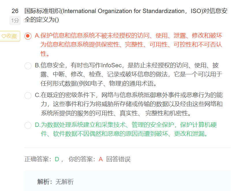 26、D.为数据处理系统建立和采集技术、管理的安全保护,保护计算机硬件、软件数据不因偶然和恶意的原因而遭到破坏、更改和泄漏。