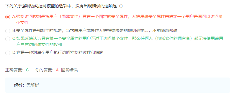 如果系统人为具有某一个安全属性的用户不适于访问某个文件,那么任何人(包括文件的拥有者)都无法使用该用户具有访问该文件的权利